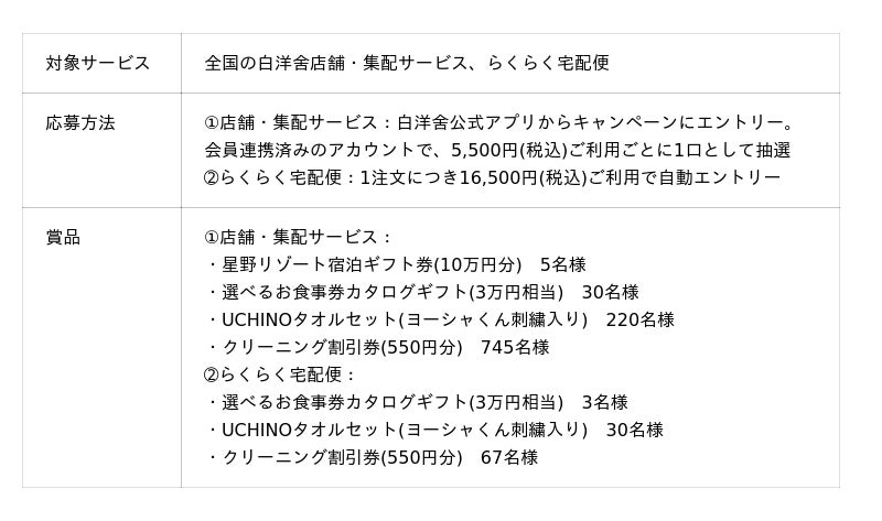 2025年10月25日(土)~11月30日(日)の期間中、対象サービスをご利用いただいたお客様の中から抽選で、星野リゾート宿泊ギフト券(10万円分)などの豪華賞品をプレゼント。白洋舍ならではの“上質な仕上がり”とともに、心も豊かになるひとときをお届けします。