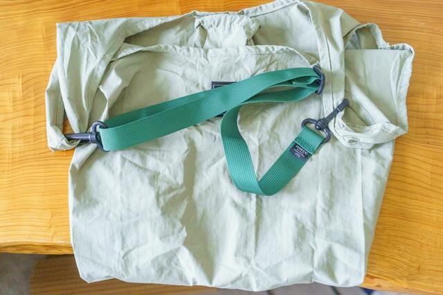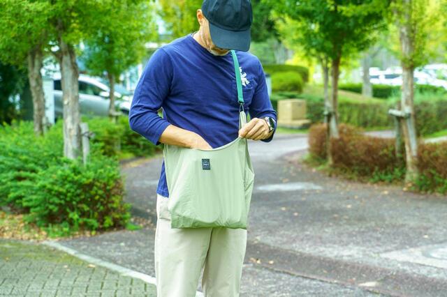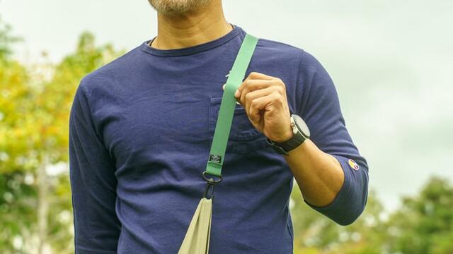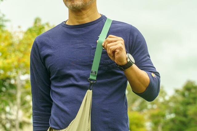 僕が気に入っているのは、小さめのエコバッグとの組み合わせ。ストラップを付けて斜め掛けすると、まるでサコッシュのような雰囲気に。