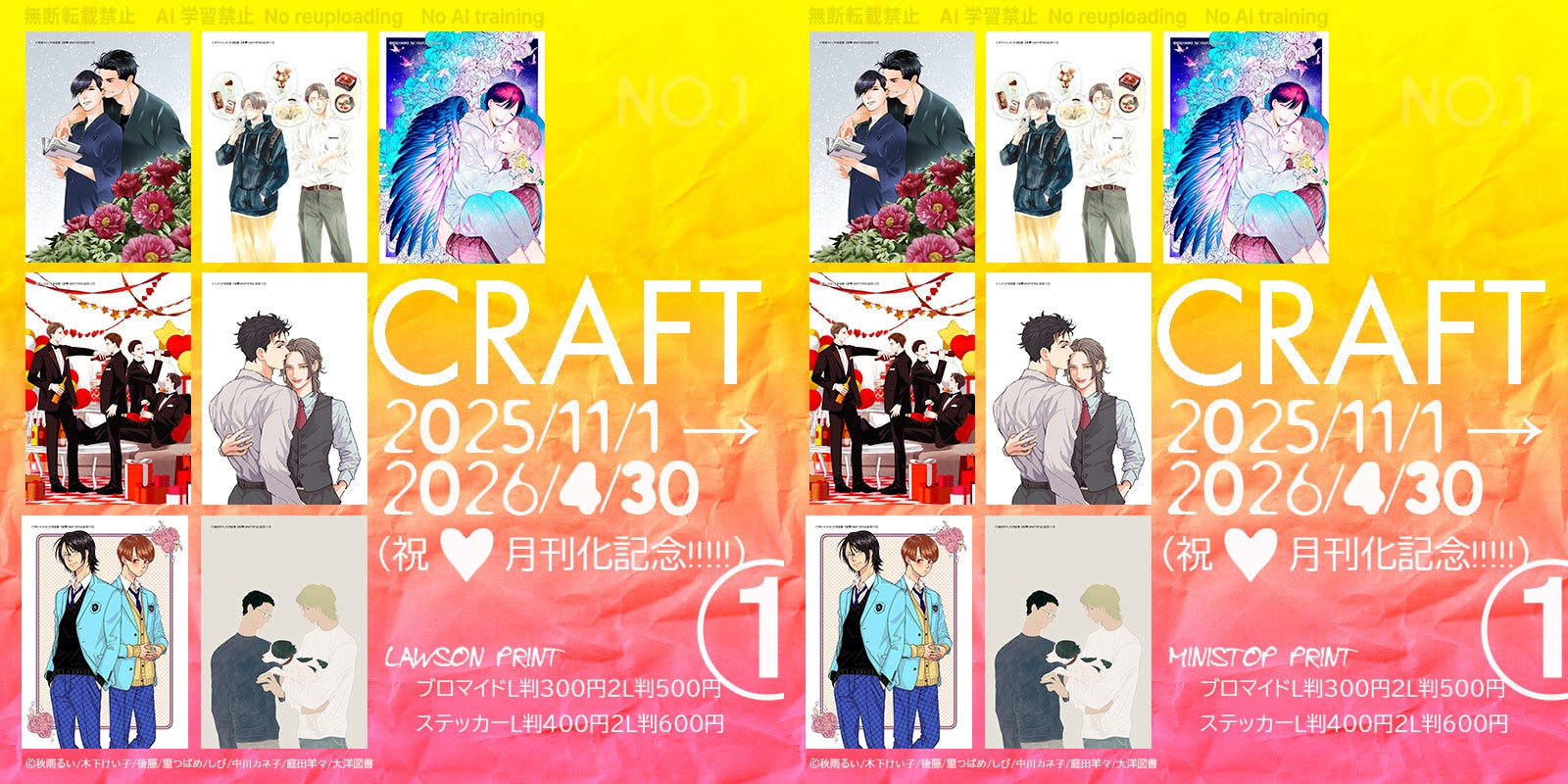 『CRAFT』祝(ハート)月刊化!!!!! 「vol.118~119」2号連続お祝い! 豪華執筆陣の先生方による描き下ろしお祝いカット/限定書店特典マンガ/ローソンプリント・ミニストッププリント限定ブロマイド