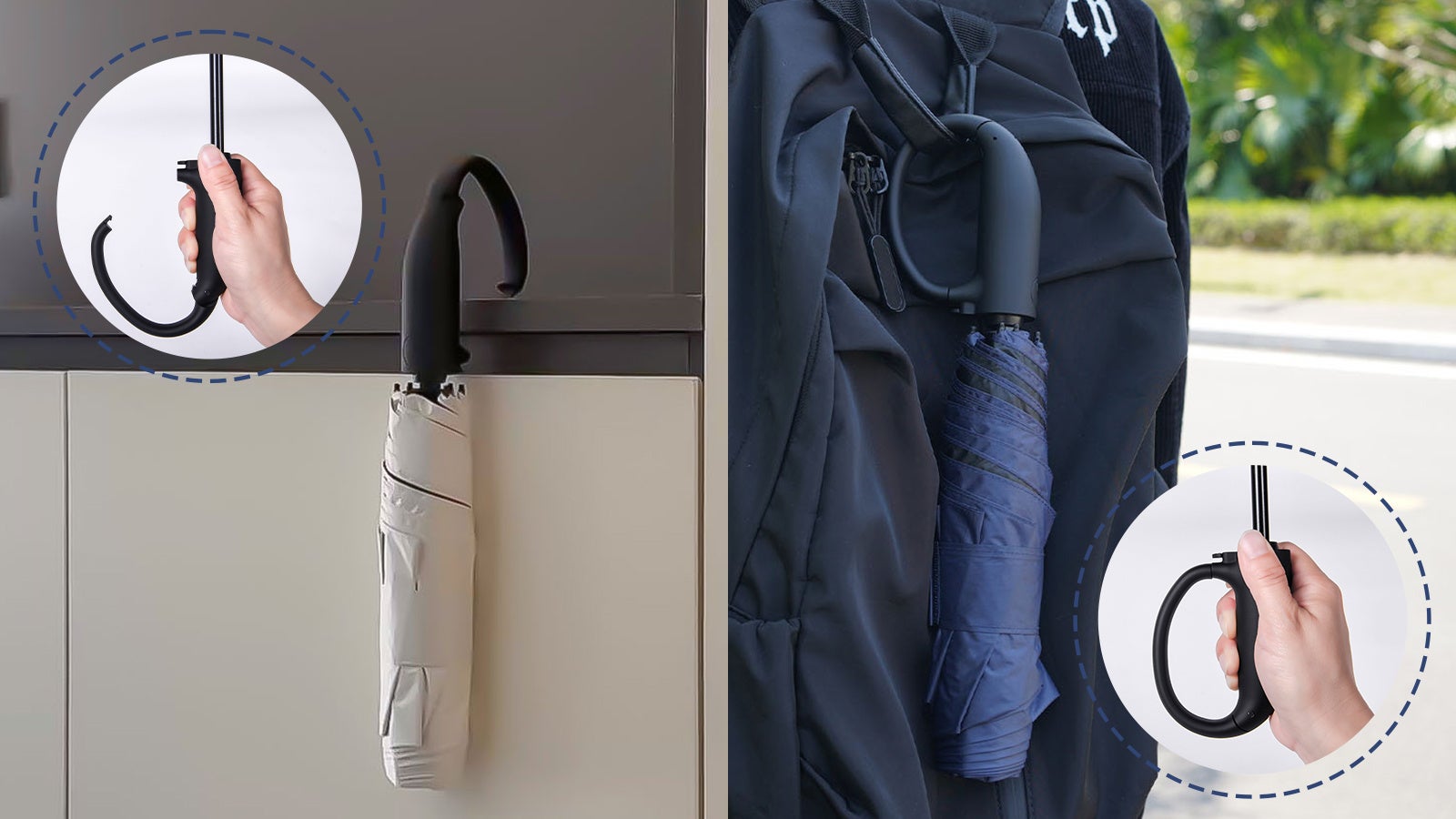 常に携帯できるよう、大口フックを持ち手に装備し、カバンやスーツケースの側面に簡単に掛けることが可能です。また、フックを開放状態にすると、従来のJ型ハンドルのように、玄関やテーブルなどに掛けられます。