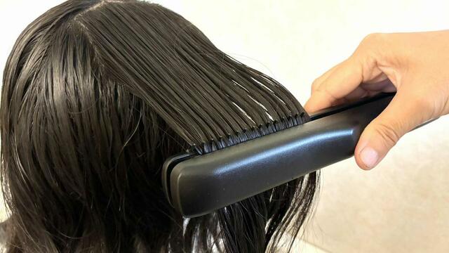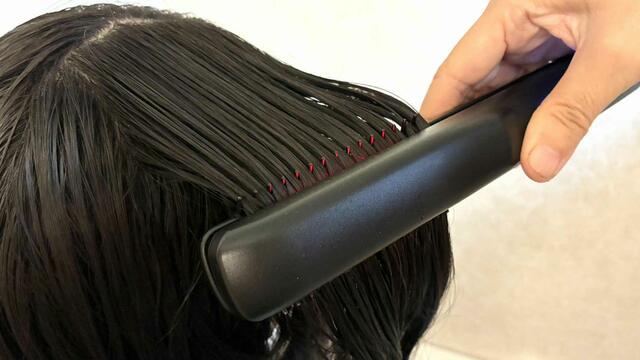髪を霧吹きなどで濡らしてからトリートメント剤を塗って、同じような手順で導入器を髪に通していきます。