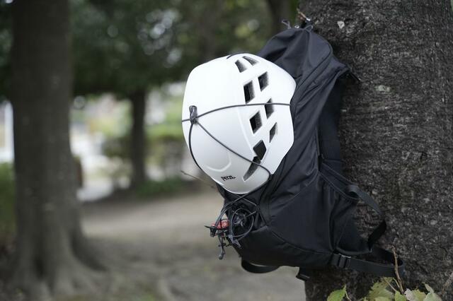 背面にあるゴムバンドは結構便利で、ヘルメットも取り付けられるくらいの余裕があります。