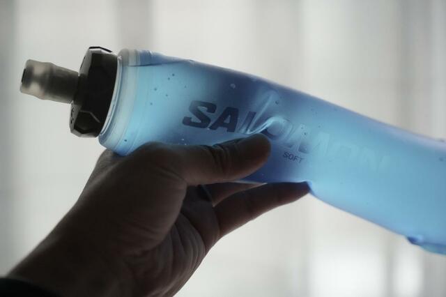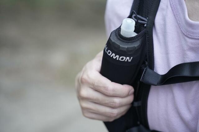 このフラスクには水を入れておき、取り付けたまま飲むことができるので、ランニング中や登山中に役立ちます。