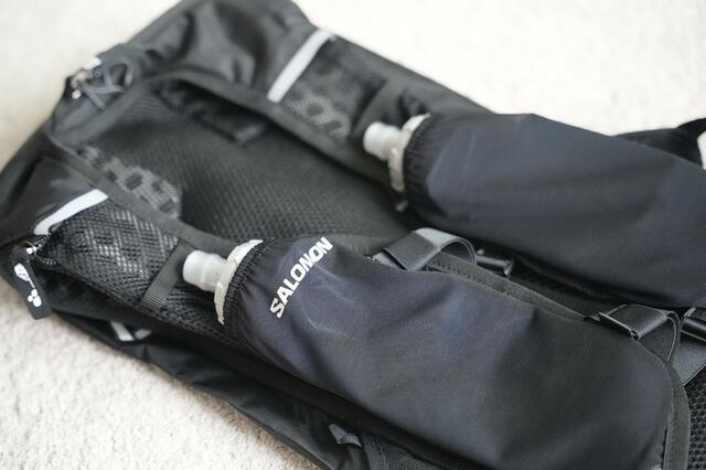 左右のショルダーストラップに付いているポケットには、500mlのソフトフラスクを入れることができます。