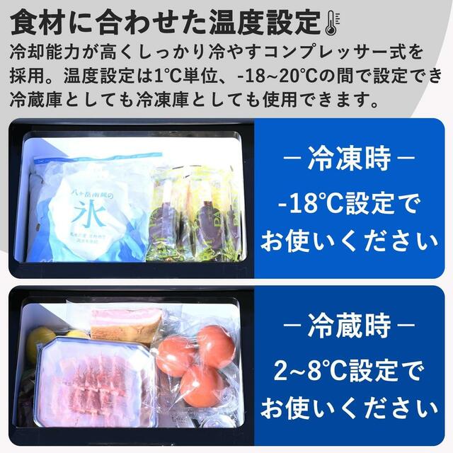 パワフルな冷却能力が特長のコンプレッサー式を採用。庫内の温度は-18℃~20℃の範囲で設定可能です。