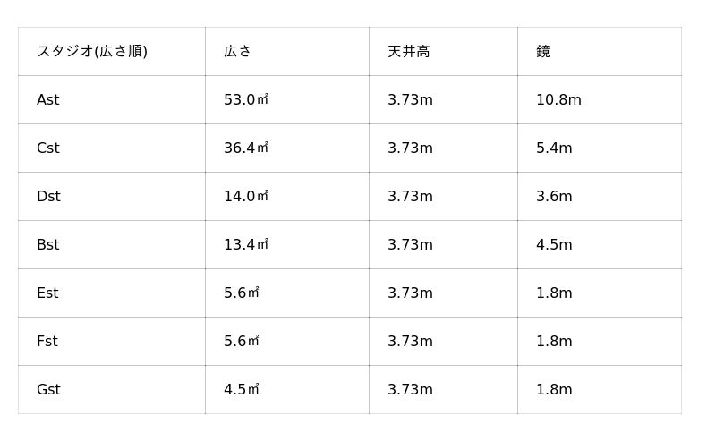 ✦【最大の特徴】業界最大級53平方メートル の大型スタジオから個人練習向けまで多様なラインナップ