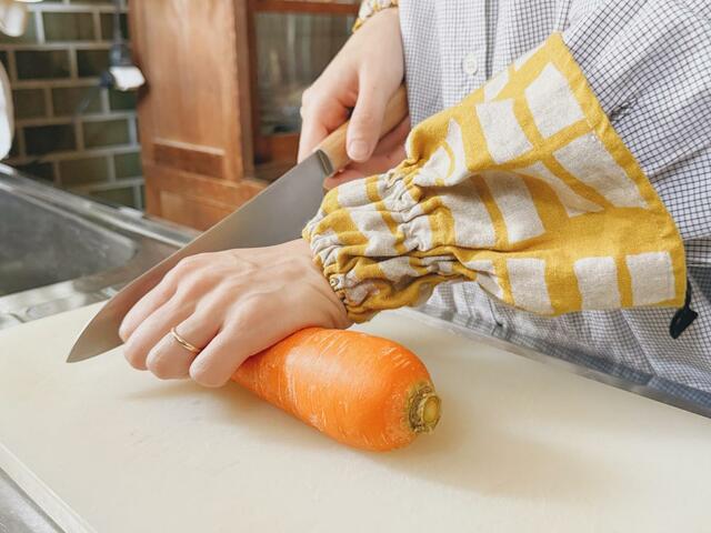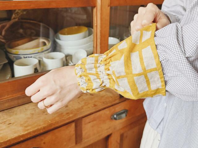 アームカバーをつけるだけで、料理や片付けがスムーズに。ちょっとしたことですが、毎日の家事がぐんと快適になっています。