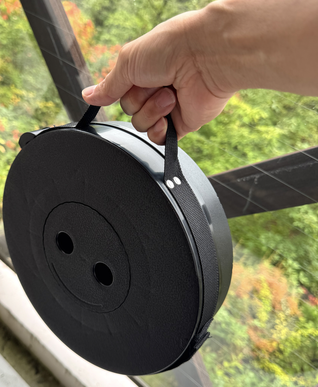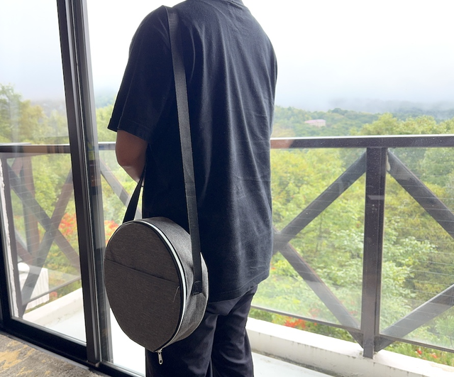 サイズは直径25.5cmで奥行き7cm。A4サイズ(21cm × 29.7cm)対応のリュックに入りました。紐付きなので、入らなくてもカバンの外側に引っ掛けて運ぶこともできそうです。