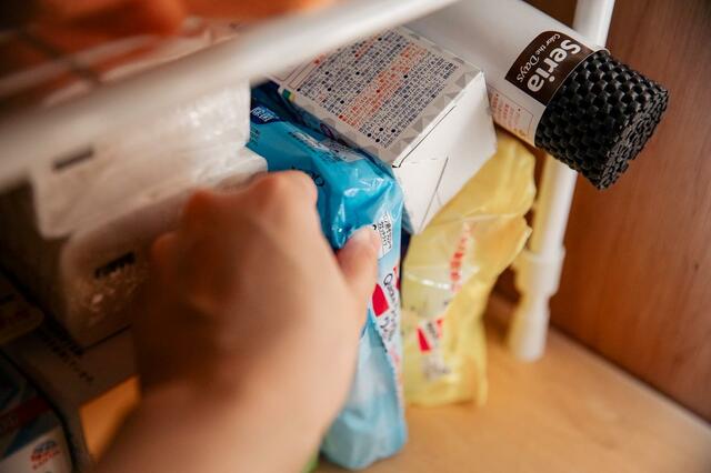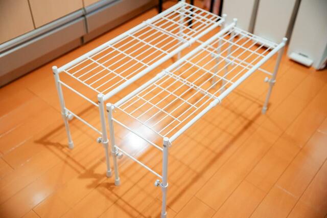 もうちょっと苦戦するかな?とも思っていたのですが、幅・高さを自在に調整できる収納棚だったからこそ、少しずつ調節できて助かりました。スタッキングできるのも便利!