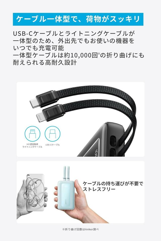 約10,000回の折り曲げに耐えられるUSB-Cケーブルとライトニングケーブル各1本が内蔵されているので、荷物が減る&ごちゃごちゃと絡まる面倒はなし。