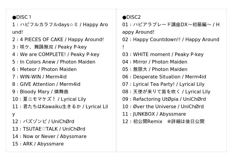 アーティスト:Happy Around!, Peaky P-key, Photon Maiden, Merm4id, 燐舞曲, Lyrical Lily, UniChØrd, Abyssmare
