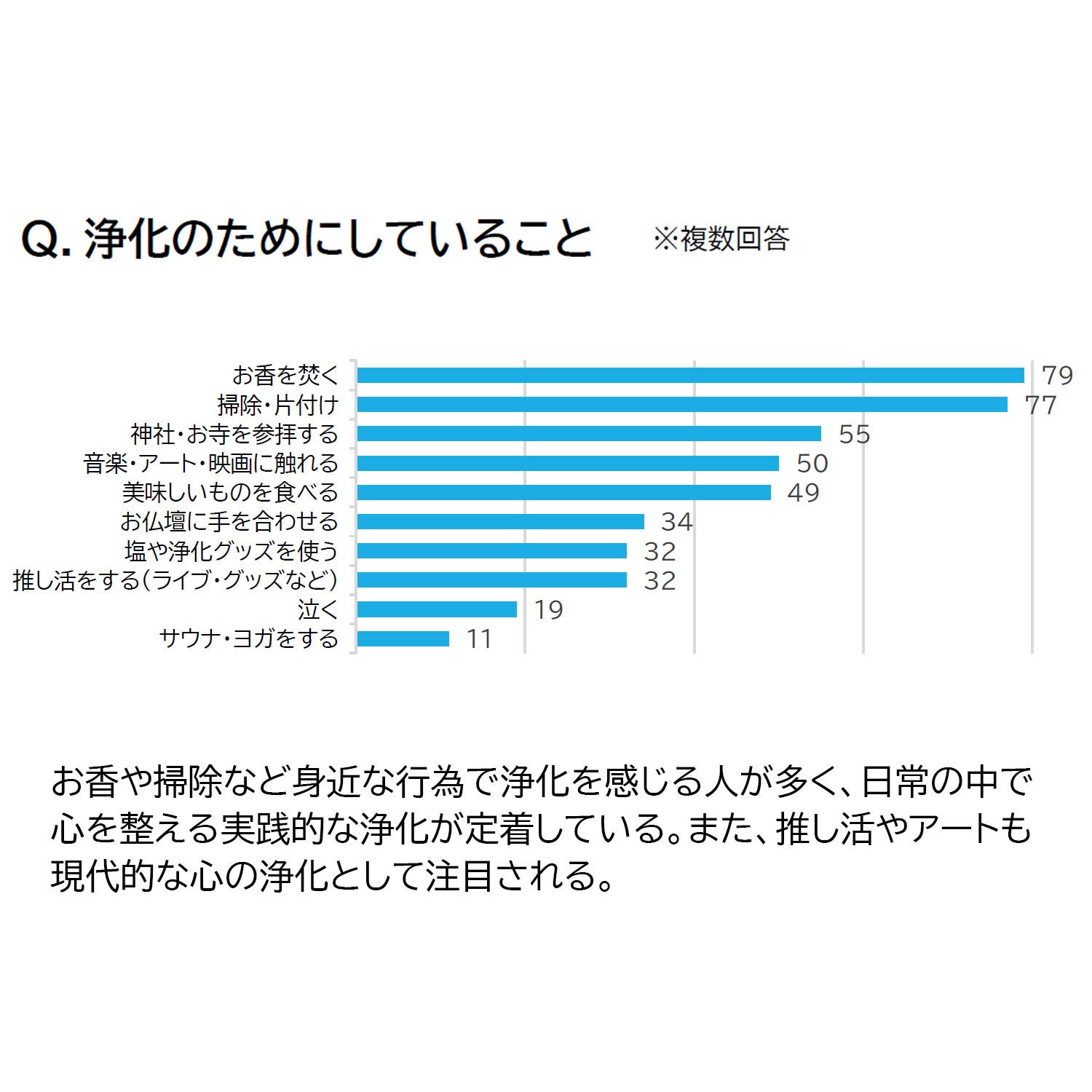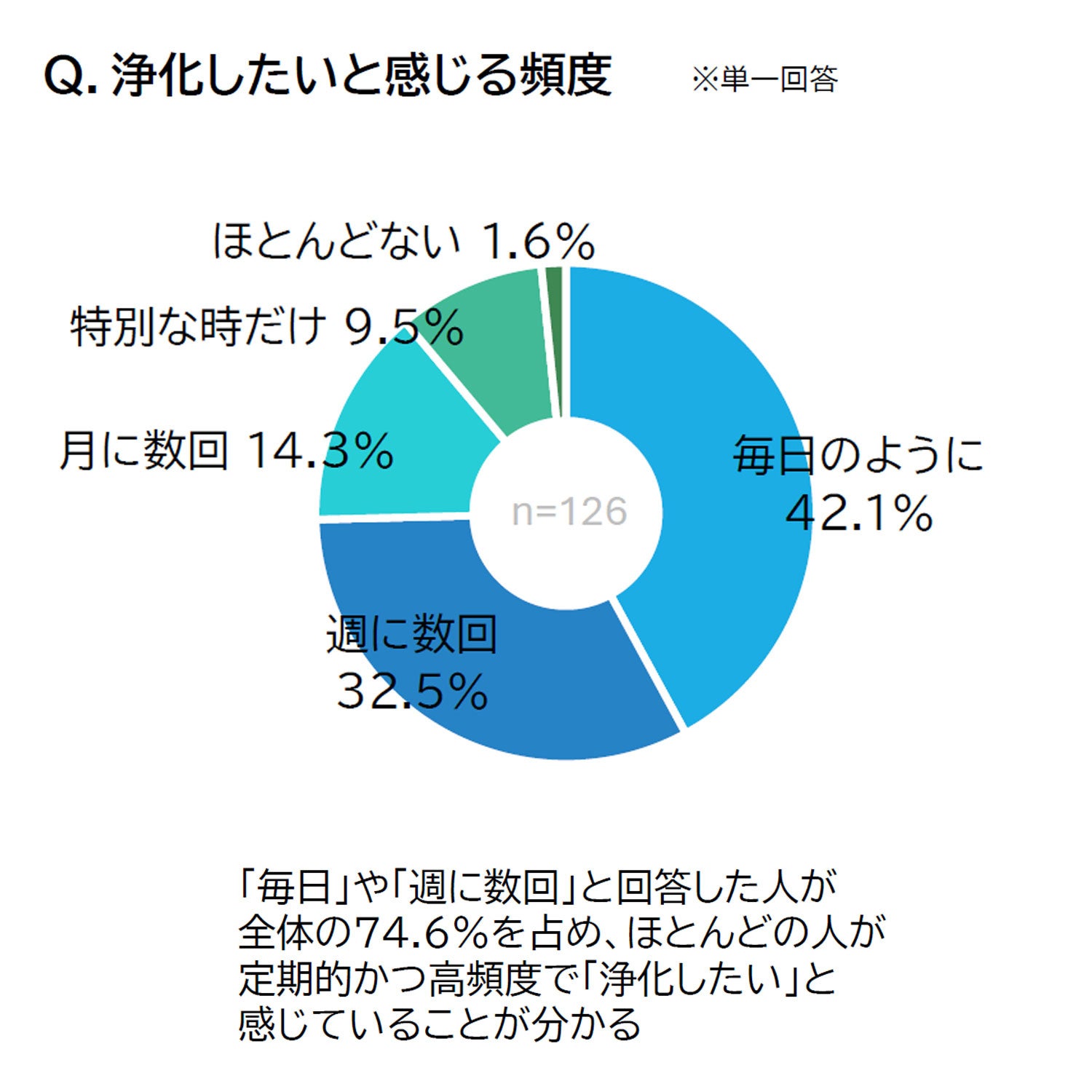 カメヤマが一般の生活者126名に行ったアンケートでは、約7割(74.6%)が「浄化したい」と感じることがあると回答しました。多くの人が“気持ちをリセットしたい”と考えており、浄化行動は日常的なセルフケアの一部になっています。