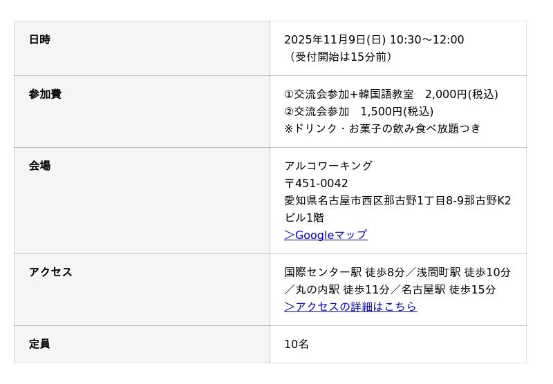 2025年11月9日(日) に、名古屋市のアルコワーキング(運営会社:室屋アフィリエイト合同会社、所在地:愛知県名古屋市西区那古野、代表:室屋清隆)にて、「日韓交流会」が開催されます。
