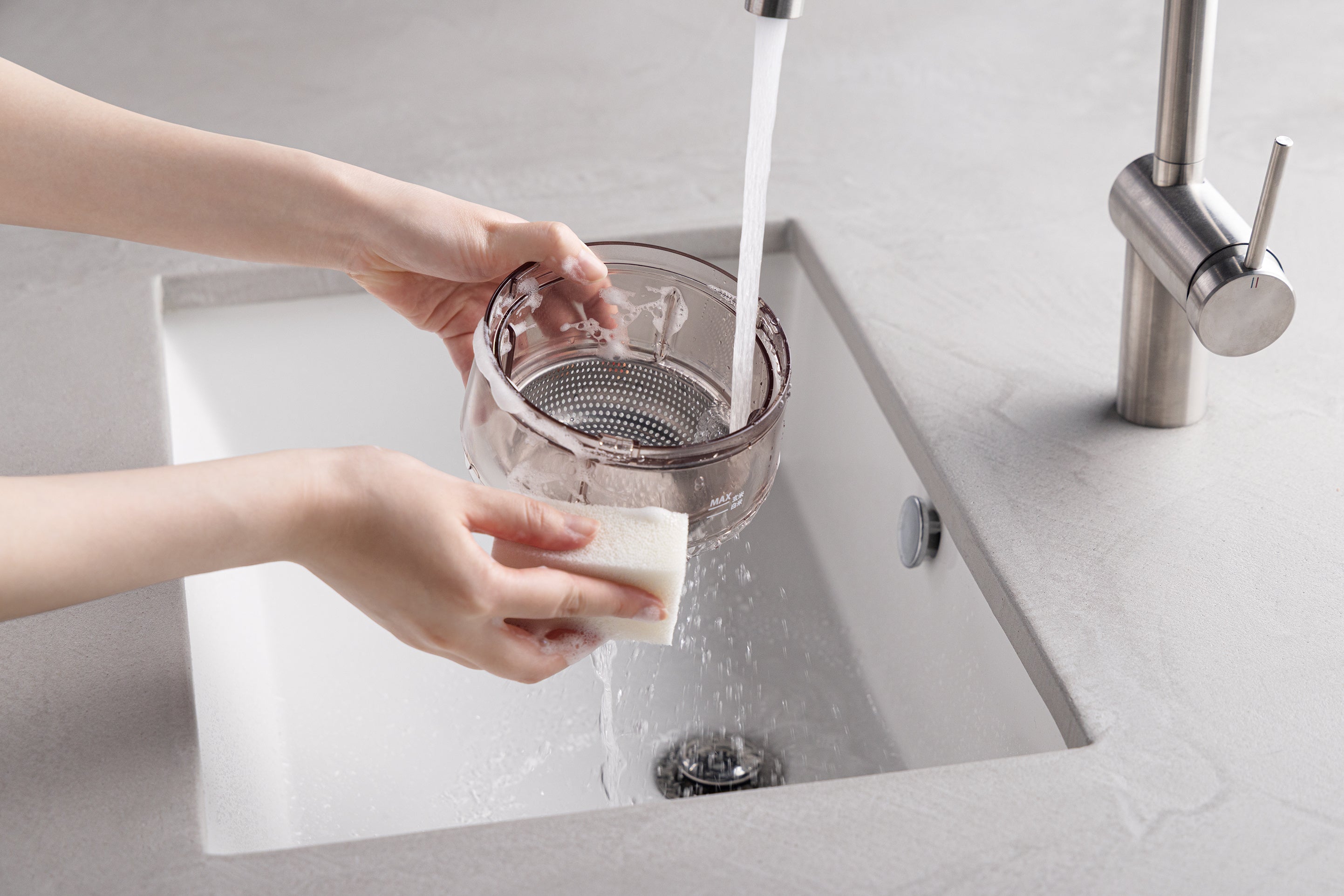 キッチンにも置きやすい幅約14cm。毎日手軽に使いやすい2合サイズ。糠は[ぬか受けトレイ]へ落ちるのでまとめて回収でき、機械部分以外の各パーツは取り外して水洗いできるので衛生的です。