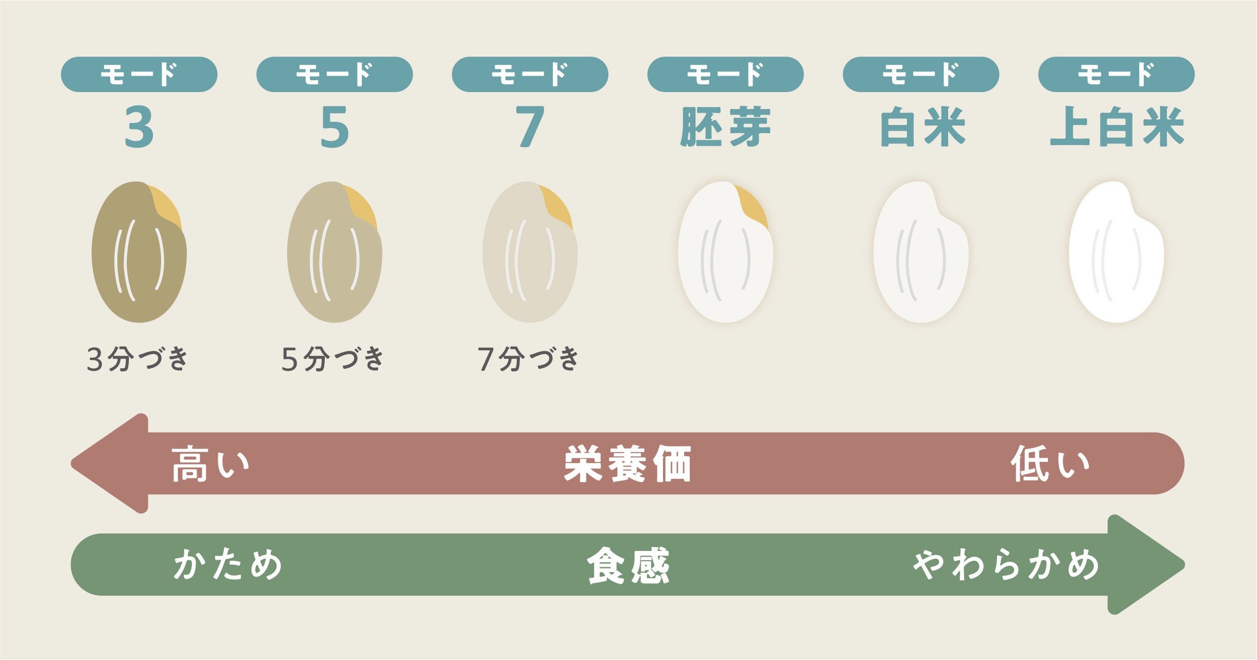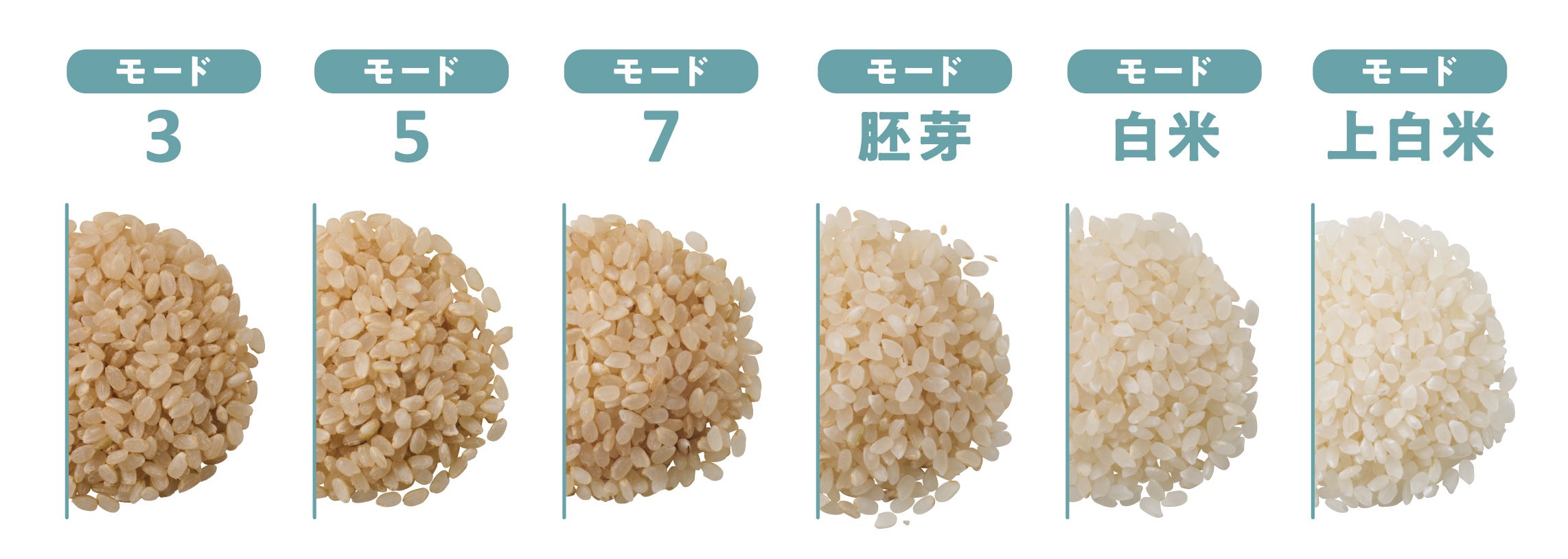 操作は、お米を入れてセットしてモードを選んでダイヤルを合わせるだけ。3分づき~上白米まで栄養価や食感などお好みにあわせて精米できます。