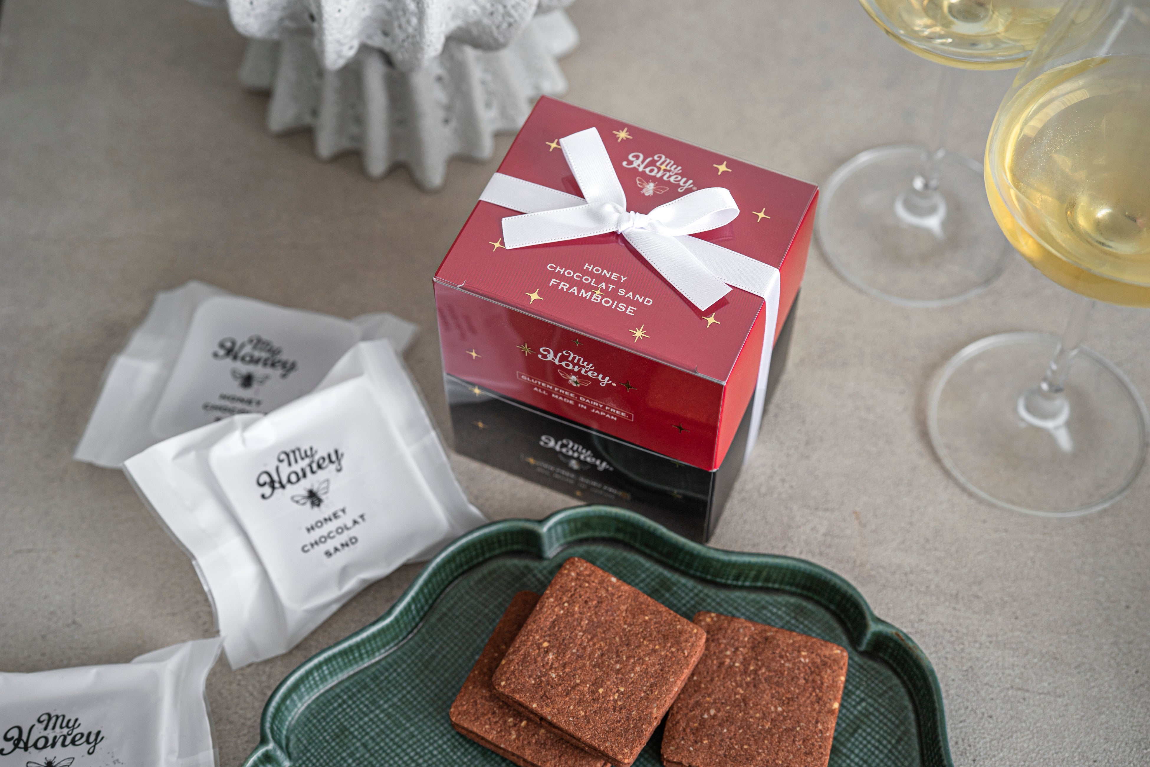 MYHONEYの「ハニーショコラサンド」は、砂糖・小麦粉・乳製品を一切使用せず、甘みは天然の生はちみつのみ。グルテンフリーで、からだにやさしい素材にこだわったチョコレートサンドです。