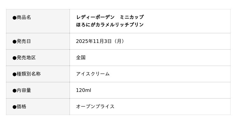 株式会社ロッテ(東京都新宿区、代表取締役社長執行役員:中島英樹)は11月3日(月)に「レディーボーデン」ブランドからミニカップの新商品となります「レディーボーデン ミニカップ ほろにがカラメルリッチプリン」を発売します。こだわりの卵とミルクを使用した濃厚プリンアイスに、ほろにがカラメルソースで大人の味わいを表現しました。甘さと苦みの絶妙なハーモニーをお楽しみいただけます。プリンアイスにはシェフ・パティシエの声から生まれた卵「エグロワイヤル(R)」を使用。コクや甘みがありながらすっきりとした味わいの卵を使用することで、アイスの美味しさを引き立てます。ふわっとやわらかいプリンアイスとダブルカラメルを使用したとろ~りほろにがソースをご堪能ください。まいにちのちょっとしたご褒美に、手軽に楽しめるプレミアムアイスです。歴史と伝統を誇るレディーボーデンの、パーソナルミニカップをぜひお楽しみください。