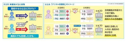 デジタル行財政改革会議で4月、高校入試の「デジタル併願制」について提言が出されました。現在、ほとんどの都道府県の公立高校入試は1校にしか出願できない「単願制」です。これに対し、「デジタル併願制」は、受験生が複数の公立高校に「志望順位」をつけて出願でき、各高校が出す「合格順位」とアルゴリズムでマッチングさせることで、スムーズに複数校の合否や進学先を決めることができる仕組みになります。受験生の後悔や都道府県の負担を減らすメリットがある一方、受験制度が大きく変わることによる混乱も予想されます。