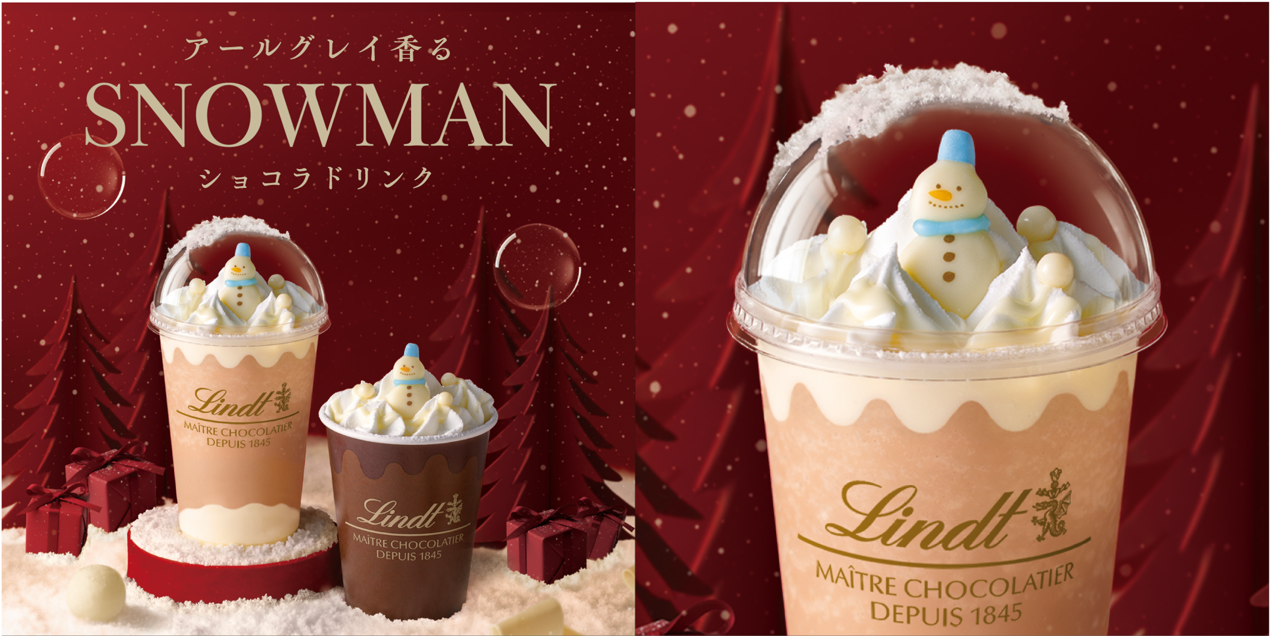 雪だるま柄のパッケージが愛らしいホリデー限定の「リンドール スノーマン」から着想を得た、アールグレイが上品に香るこの冬限定の新作『SNOWMAN ショコラドリンク』が新登場します。降り積もる雪のように繊細なホワイトチョコレートと、アールグレイを加えたミルクチョコレートが織りなす、ほっと心ほどける大人な味わい。その日の気分に合わせて「ホット」と「アイス」、2種類のドリンクからお選びいただけます。