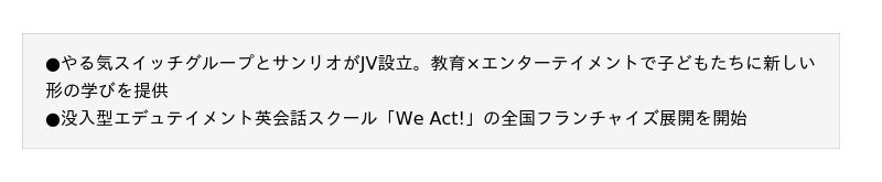 総合教育サービス企業の株式会社やる気スイッチグループ(東京・中央区、代表取締役社長:高橋 直司、以下 やる気スイッチグループ)と株式会社サンリオ(東京・品川区、代表取締役社長:辻 朋邦、以下、サンリオ)は、没入型エデュテイメント英会話スクール「We Act!」のフランチャイズパッケージ開発と拡販・導入支援を実施する合弁会社「株式会社サンリオやる気エデュテイリング」を2025年9月1日(月)に設立いたしました。
