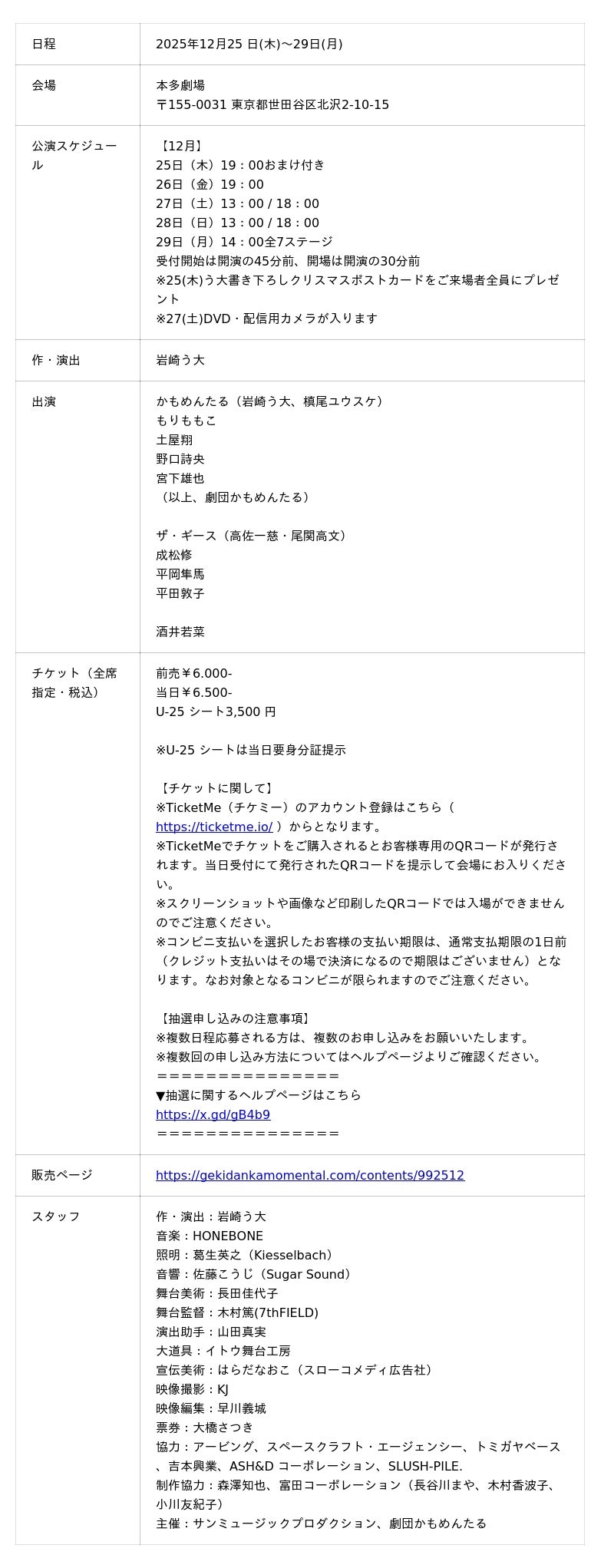 株式会社チケミー(本社:東京都港区、代表取締役:宮下大佑)が運営する電子チケットプラットフォーム「TicketMe(チケミー)」は、演劇ユニット「劇団かもめんたる」による第15回公演『奇跡かな』の劇団かもめんたる同好会先行チケットを販売開始いたしました。本公演は、2025年12月25日(木)から12月29日(月)まで下北沢・本多劇場にて上演予定です。