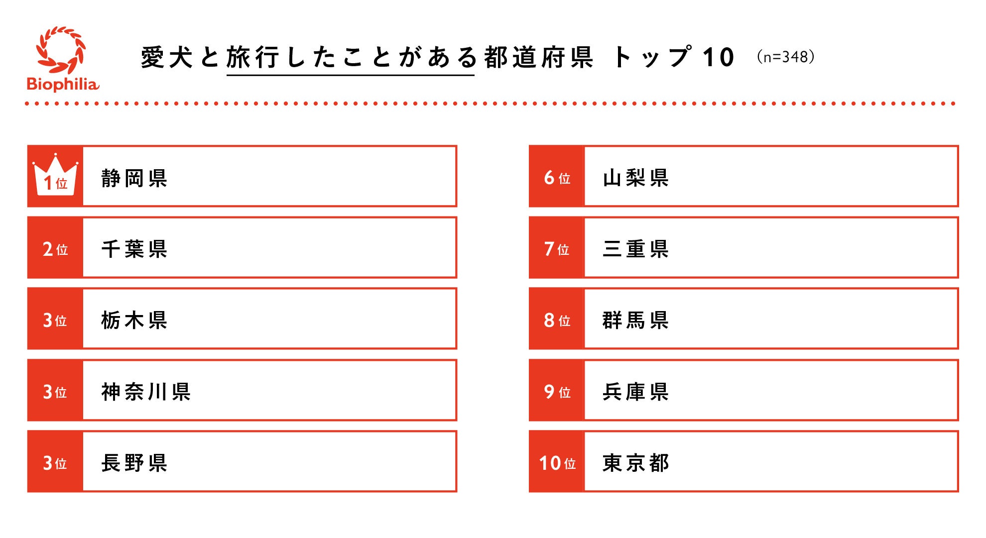 - 愛犬と行った旅行先ランキング、1位:静岡県、2位:千葉県、3位:栃木県