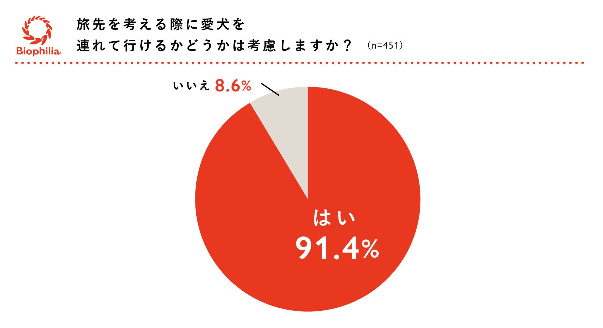 - 旅先選びに愛犬を連れて行けるかどうかを考慮する人は91.4%
