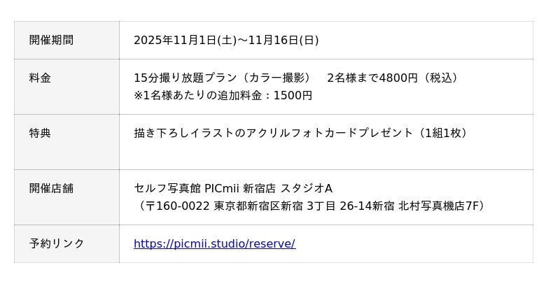キタムラ・ホールディングス グループのピックハイブ株式会社(本社:東京都新宿区、代表取締役社長兼COO:大迫 由典)が運営する「セルフ写真館 PICmii(読み:ピックミー) https://picmii.studio/ 」は、新宿 北村写真機店の7Fに位置するセルフ写真館 PICmii新宿店で2025年11月1日(土)から11月16日(日)までの期間中、バーチャルシンガー「初音ミク」とコラボレーションした特別スタジオをご用意します。なお本企画は、新宿 北村写真機店でも実施されるカメラのキタムラと初音ミクのコラボレーションイベントと連動した企画です。