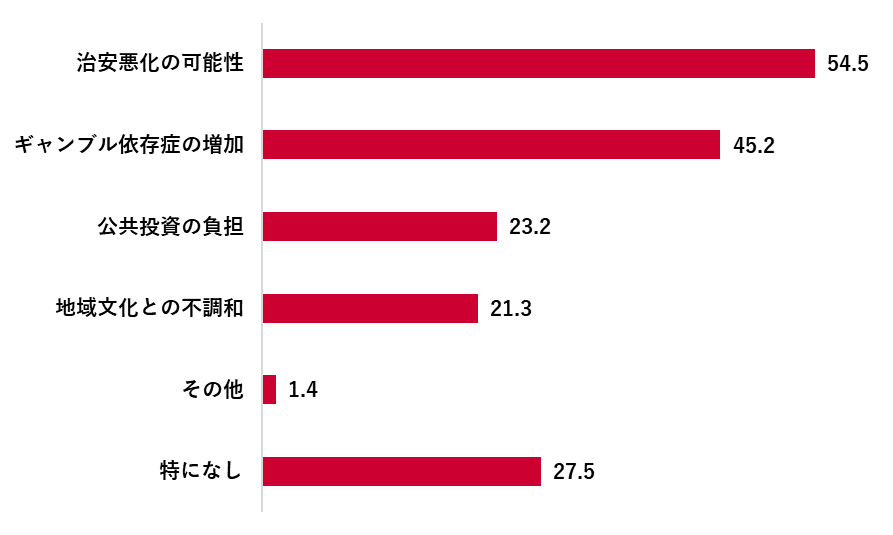 懸念点については「治安悪化の可能性」(54.5%)、「ギャンブル依存症の増加」(45.2%)が上位となり、安全や社会的影響への不安がうかがえる。