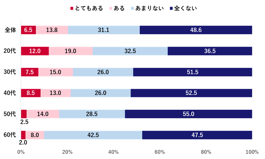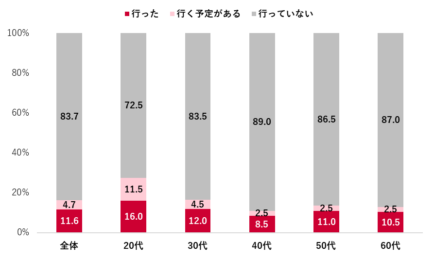 年代別で見ると、20代では「行った」が16.0%、「行く予定がある」が11.5%と、他の年代よりも高かった。