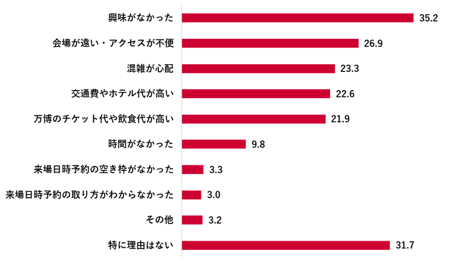 大阪・関西万博に「行っていない」(83.7%)と回答した方を対象に、行かなかった理由を伺ったところ、「興味がなかった」(35.2%)がトップ、次いで「会場が遠い・アクセスが不便」(26.9%)だった。「特に理由はない」との回答が31.7%だった。