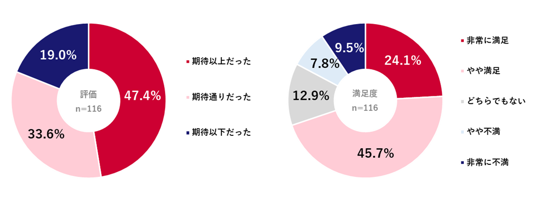 来場者の評価は総じて高く、「期待以上」47.4%、「期待通り」33.6%だった。合わせると約8割が肯定的に評価していた。満足度は「非常に満足」24.1%、「やや満足」45.7%で合わせると70%近かった。
