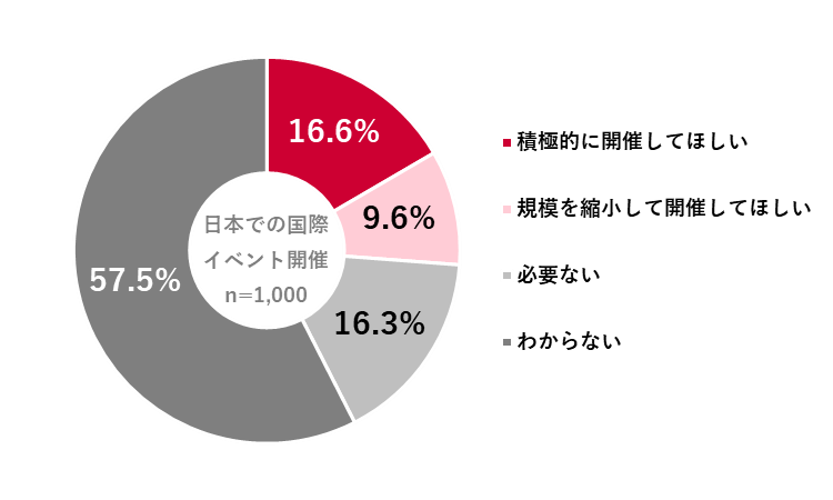 今後、日本で万博や五輪などの国際イベントを開催することについて、「積極的に開催してほしい」と回答した人は16.6%にとどまった。また、「わからない」が57.5%と多数を占めた。