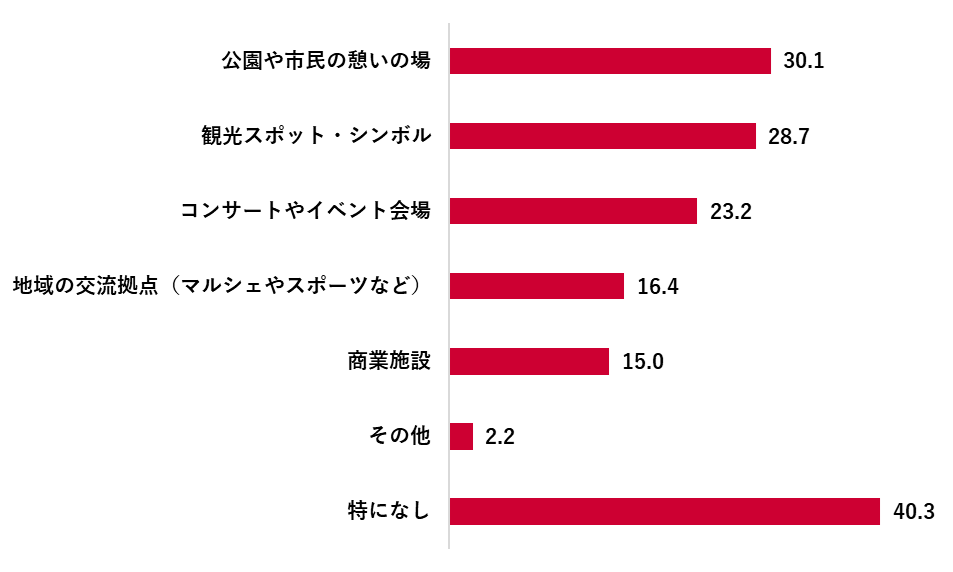 万博閉幕後の「大屋根リング」などの施設をどのように活用するとよいか聴取したところ、「公園や市民の憩いの場」(30.1%)、「観光スポット・シンボル」(28.7%)が上位だった。一方で、「特になし」が40.3%となった。