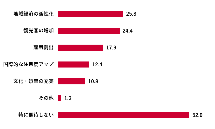 IRの開業による効果として「地域経済の活性化」(25.8%)や「観光客の増加」(24.4%)を期待する一方で、「特に期待しない」が52.0%だった。