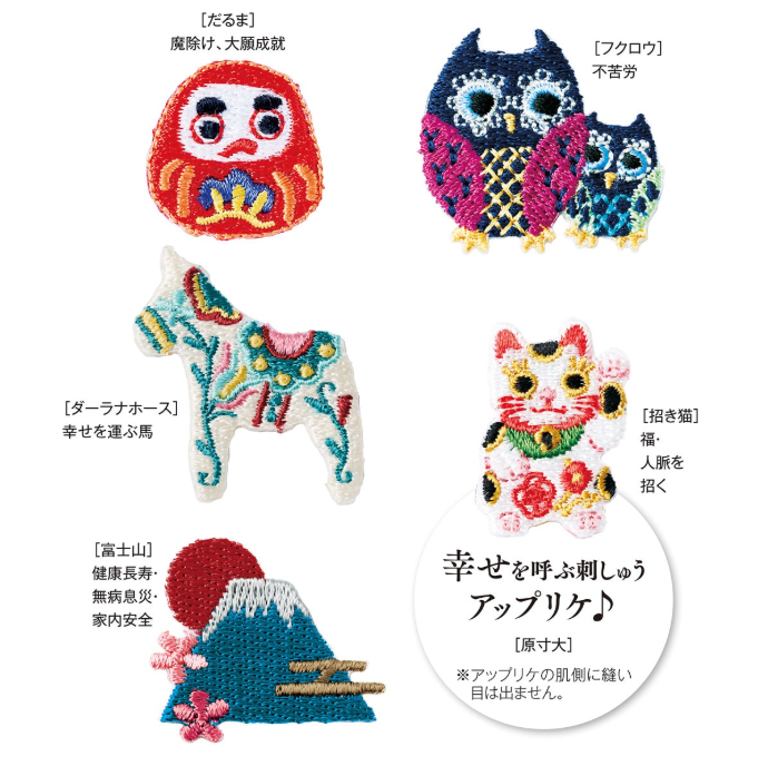 ショーツやブラの施した"幸せを呼ぶ"アップリケが、今年は単品でも登場。だるまやふくろうなどの縁起物のほか、来年の干支にちなんで「幸せを運ぶ馬」として北欧で親しまれるダーラナホースが仲間入りしました。アイロン接着はもちろん、シールとしても貼り付け可能。お好きな場所にペタッと貼り付けて、ときめきをプラスしてみてください。