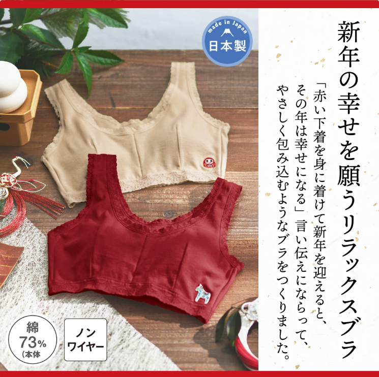 「赤い下着を身に着けて新年を迎えると、その年は幸せになる」という言い伝えにならって企画した、やさしく包み込むようなブラジャーです。ショーツとおそろいの縁起のいいモチーフのかわいいアップリケがポイント。ぐーんとよく伸びる綿混素材で締めつけを感じさせないやわらかさが、心地よさを演出します。