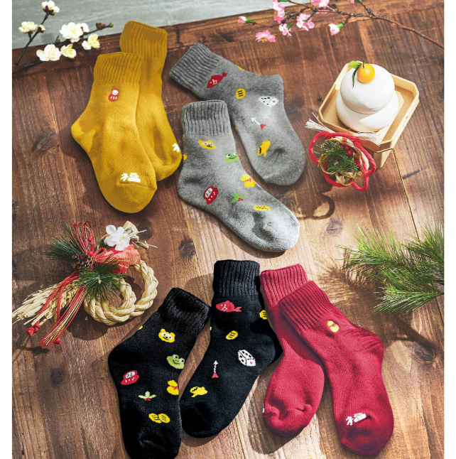 開運にまつわる10個のモチーフを散りばめた、新年ムード満開のソックス。肌側は全面パイル仕様でふかふかとした踏み心地。年末年始のご挨拶や、身近な方への贈り物にもおすすめです。