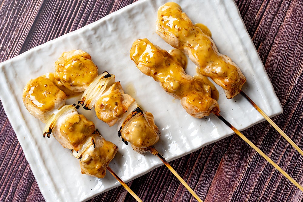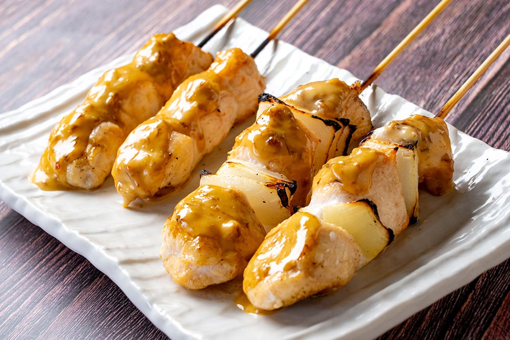 むね肉串/ささみ肉串に、北海道発・三升漬をベースにしたマヨネーズソースを掛けてご提供。