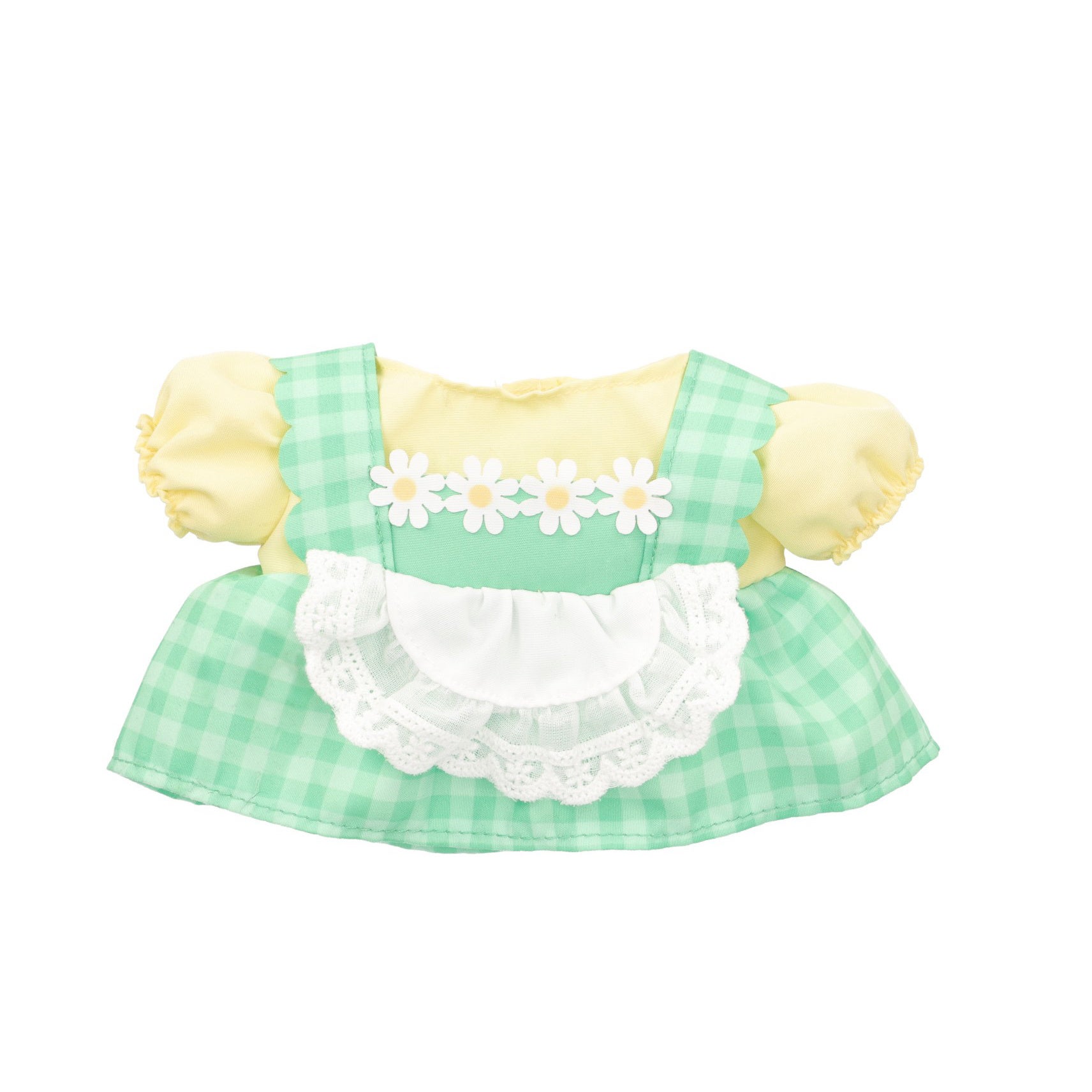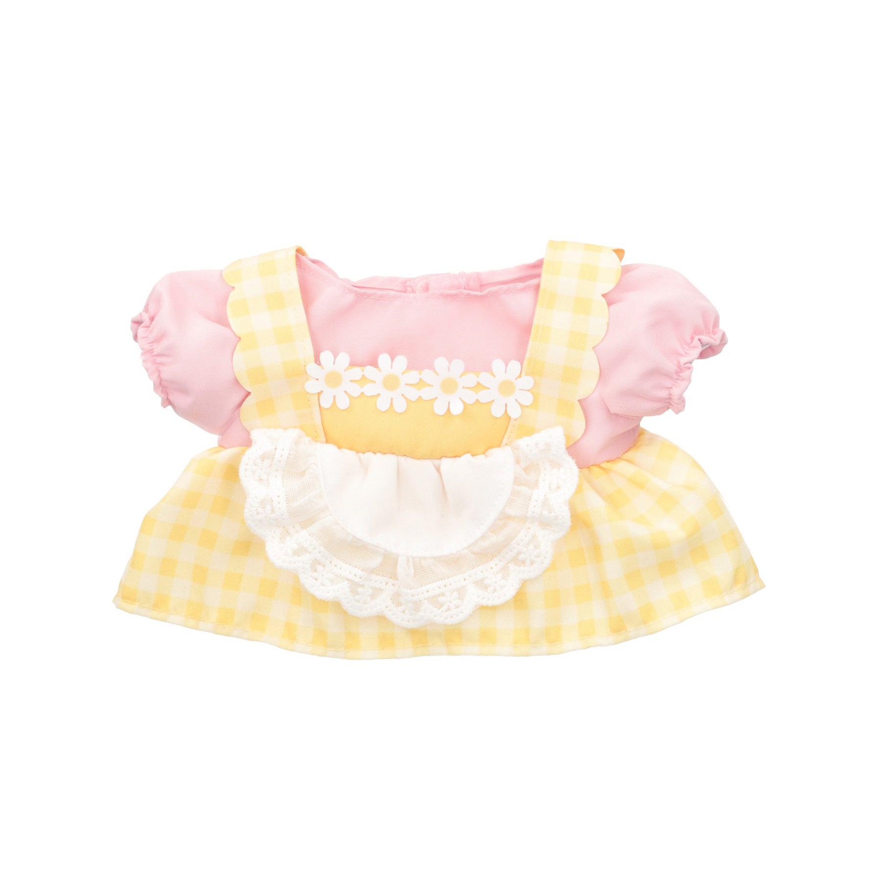 着せかえほわほわぬいぐるみ専用のお洋服に、初のエプロンドレススタイルが登場します。ギンガムチェックの生地に胸元にカモミールをイメージしたモチーフをあしらい、肩ひも部分をスカラップ型にするなど、かわいらしさ満載のアイテムです。