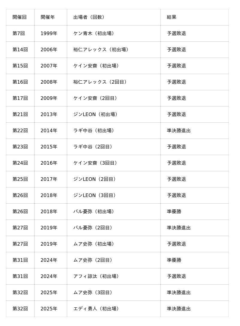 ラギ中谷は2014年にハワイで開催された世界大会で準決勝に進出、アフィ諒汰は2024年に同じくハワイで開催された世界大会への出場経験をもちます。