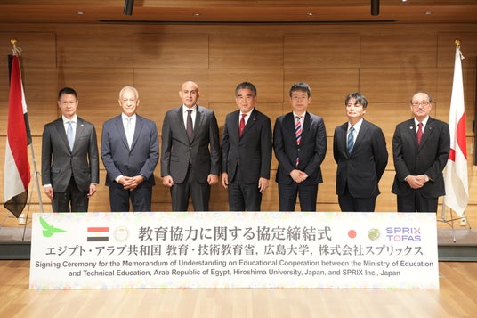 株式会社スプリックス(本部:東京都渋谷区/代表取締役社長:常石博之、以下「スプリックス」)は、2025年10月27日、エジプト・アラブ共和国の教育・技術教育省(以下「エジプト教育省」)のモハメド・アハメド・アブデル・ラティフ大臣及び、国立大学法人広島大学(以下「広島大学」)の越智光夫学長と、ICT・AI・プログラミング教育におけるカリキュラム及びその評価に使われるTOFAS(Test of Fundamental Academic Skills - 国際基礎学力検定)の学術的な信頼性向上に向けた、三者協力体制の構築に関する協力覚書(Memorandum of Understanding、以下「MOU」)を、広島大学にて締結いたしました。
