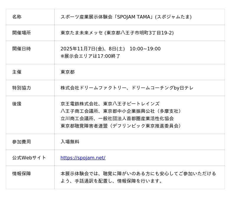 東京都は、本イベント1週間後に開催されるデフリンピックを視野に、パフォーマンス向上、健康促進、障がい者スポーツなどを網羅する、東京西部では数少ないスポーツ産業振興を目的とした展示体験会「SPOJAM TAMA」(スポジャムたま) を、東京たま未来メッセ (八王子市) にて開催します。