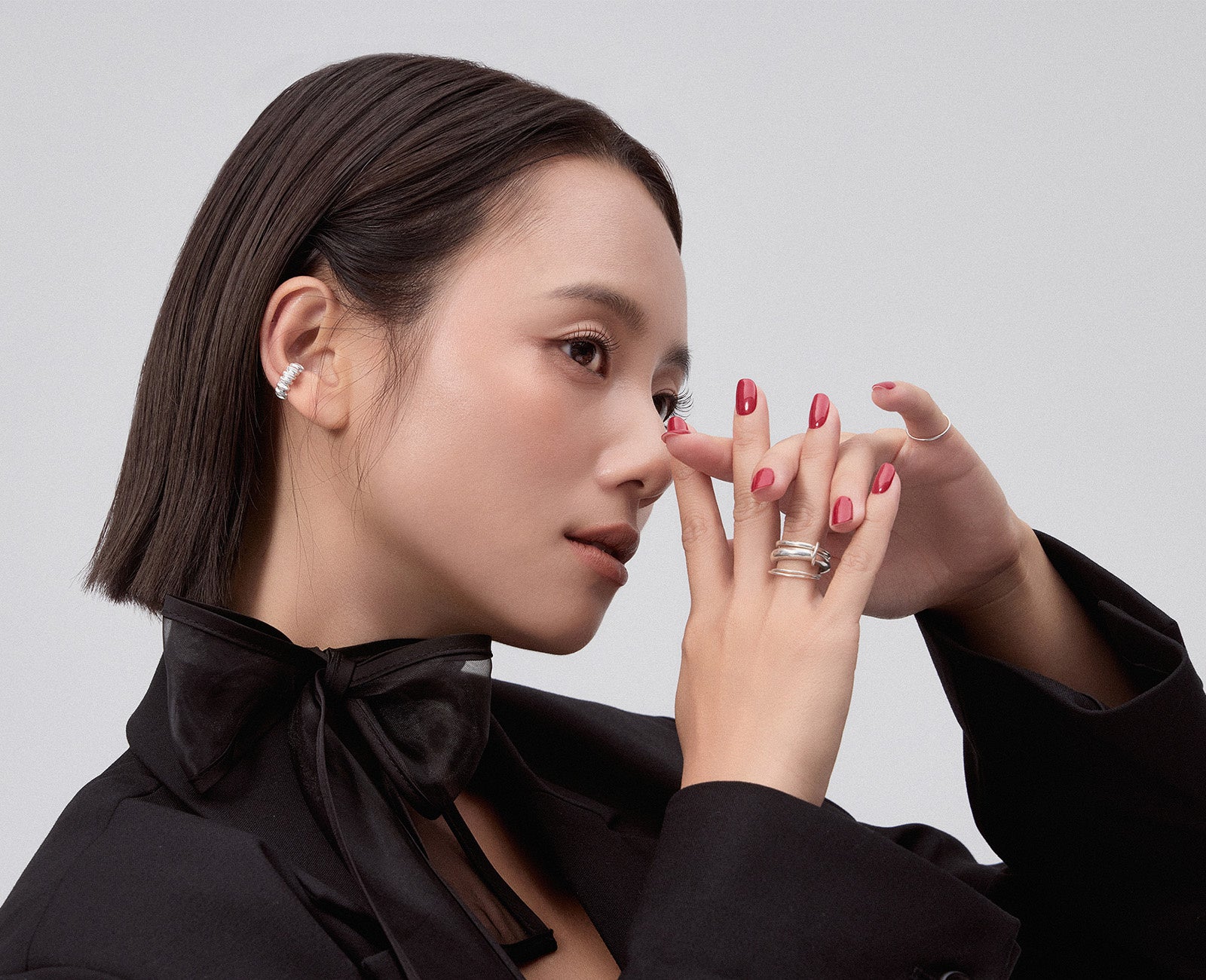 鮮やかで深みのあるレッドが、手元をぐっと引き立て、視線を釘付けにします。