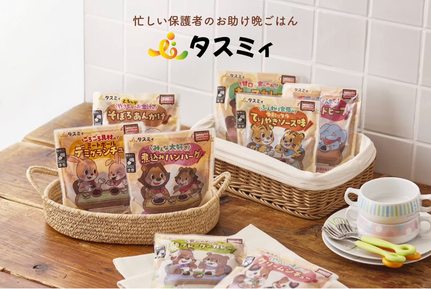 『タスミィ』は、保育施設で必要な分だけ夕食のおかずを購入できるハウス食品グループのレトルト惣菜ブランドです。忙しい日の保育園お迎えついでに夕飯のおかずを持ち帰ることができ、帰宅後すぐに親子で温かい食卓を囲めるよう開発されました。サービス名の「タスミィ」には“+me(私を足して)”という意味が込められており、「頑張るお父さん・お母さんの助けになりたい」という想いが詰まっています。『タスミィ』の主な特徴