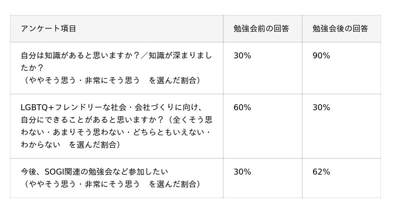 このSOGI勉強会を実施する前に、参加者に向けて、意識調査を行いました。また勉強会終了後、参加者を対象にアンケートを実施し、勉強会の前と後とで比較したところ、D&I推進に対する高い意識変革が確認されました。