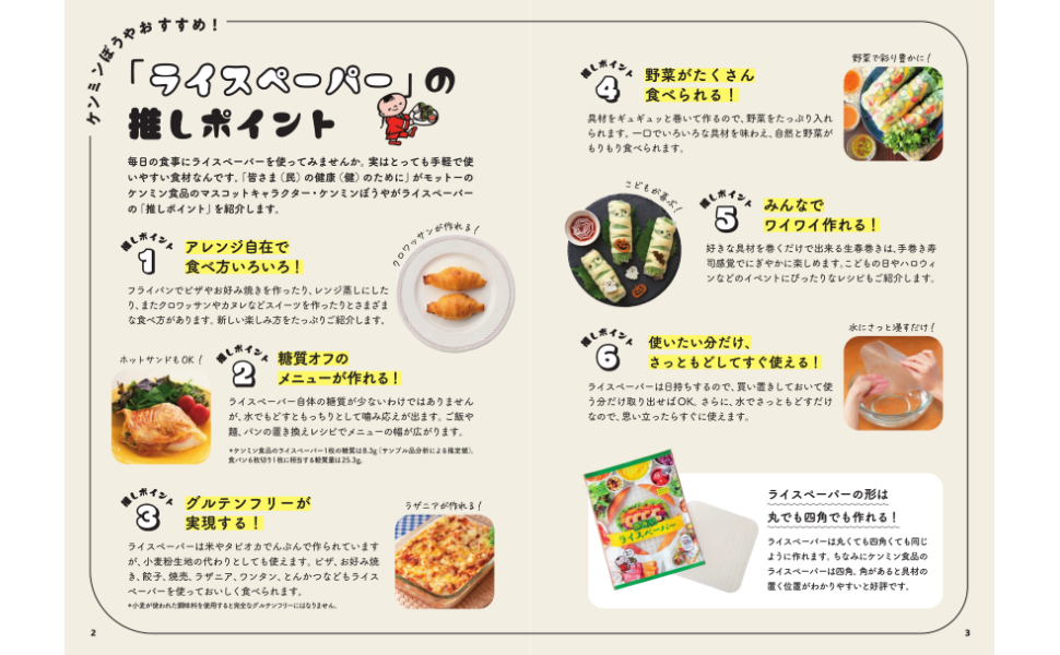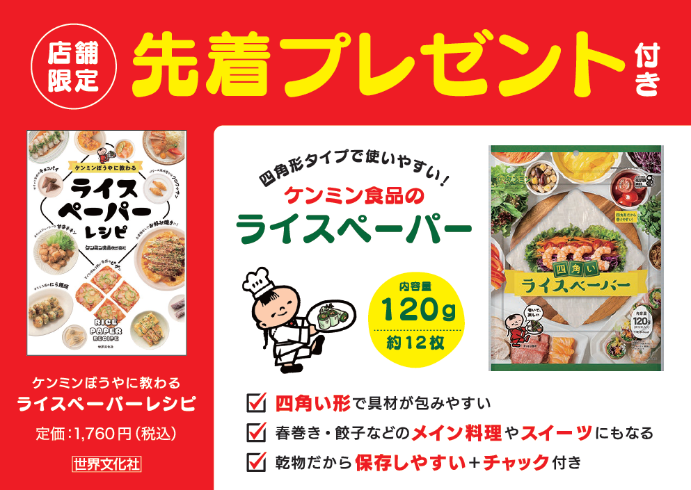 『ケンミンぼうやに教わる ライスペーパーレシピ』の発売を記念して、一部書店にてケンミン食品「ライスペーパー」(無料)をつけた書籍を販売いたします。詳しい書店情報は下記よりご覧ください。