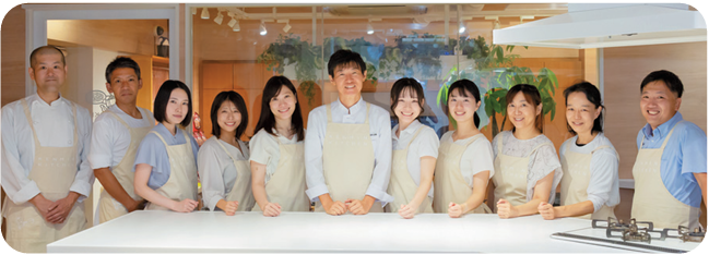 1950年創業。台湾出身の創業者・高村健民が神戸でビーフンの製造をはじめる。当時、日本ではなじみのなかったビーフンを広めるために開発した商品が「ケンミン焼ビーフン」で、その手軽さとおいしさから広く知られるようになる。以来、ビーフンのほか、ライスペーパー、 フォー、ライスパスタなどお客さまの健康に貢献したいという願いのもと、おいしさ、安全性、 高品質にこだわったお米を原料とした食品を開発。写真は一日一レシピ開発メンバー。右から5番目は一日一レシピ編集長の獅子原里実さん。左隣はメンバーの一人、高村祐輝社長。