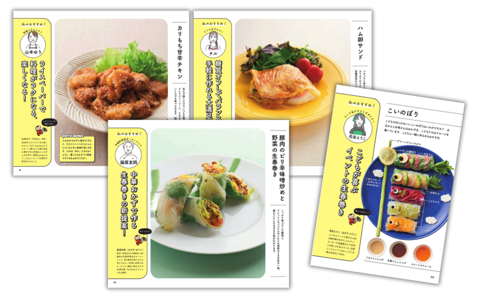 料理コラムニストの山本ゆりさん、中国料理店オーナーシェフの脇屋友詞さん、インスタグラマーのチルさん、フード&クラフトデザイナーの花田えりこさんが、それぞれの得意分野を活かした「私のおすすめ!ライスペーパーレシピ」を提案。平日の時短おかずから週末のおもてなし料理、糖質を気にする方向けのヘルシーメニュー、子どもが喜ぶパーティー料理まで、ライスペーパー1枚でどんなシーンも華やかに変身させます。