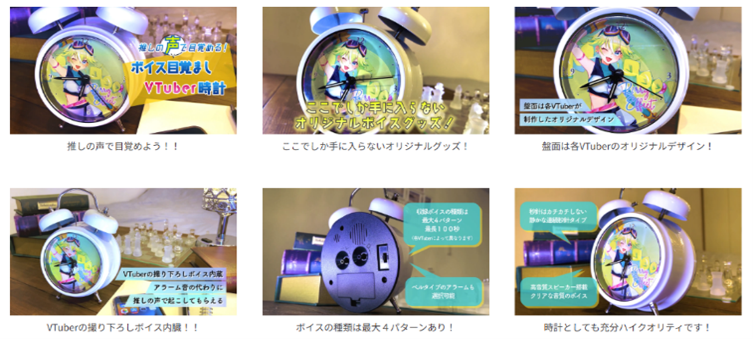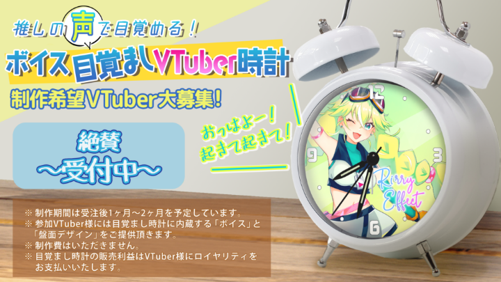 VTuber時計に参加しているVTuberの音声と文字盤をオリジナルで1個から受注生産し、現在、7,700円(税込)で販売している既存の白い「ボイス目覚ましVTuber時計」も、今回2025年11月1日(土)~2026年3月31日(火)までの期間中に申し込みいただいた方には限定の特別記念価格6,000円(税込み)で受注生産、販売をします。(一部商品化、販売ができないVTuberもいます。予めご了承下さい)